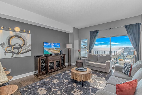 Perched on the 23rd floor, this modern condo boasts an amazing ocean view and two balconies. Unwind in style with a fully-equipped kitchen, granite countertops, and comfortable queen beds. Enjoy all the essentials provided for your stay.
