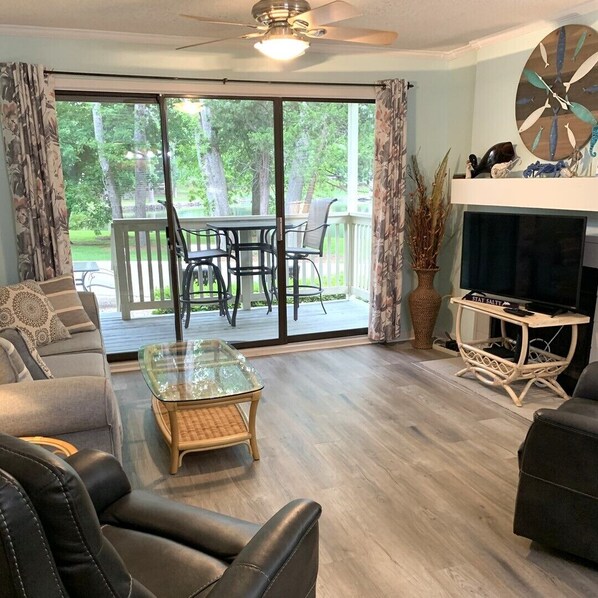 Welcome to Saltwater Serenity, located in Richmond Park at Kingston Plantation. This 3BR/2BA villa/townhouse is close to everything while offering a serene ambience. Highlights include an updated kitchen, private outdoor spaces with seating for alfresco dining, a washer/dryer, and a gated entrance with a guard. This single story townhouse is located on the ground floor and does not have stairs at the entrance. There are three steps between the back porch and back patio.