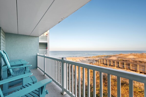 This is a second floor (technically third, as there is pull-under parking), updated, oceanfront condo with two bedrooms, and two baths. Sleeping arrangements include a king-sized bed, queen bed and twin bed. Linens (bath towels, washcloths, sheets) are provided by an independent vendor. Beds will be made when you arrive!