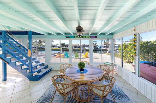 Outdoor living is where Reel Relaxation truly shines and creates unforgettable family memories. The private waterfront backyard offers front-row views of dolphins and manatees, stunning sunset skies, and a peaceful canal setting. With direct Gulf of America access, guests can be on the water within minutes for boating, fishing, kayaking, shelling, and exploring the 10,000 Islands. A private dock, outdoor seating, a fishing light to attract fish at night, and a gas grill for cooking the day’s catch. Colorful Adirondack chairs invite families to relax together, while the outdoor shower makes rinsing off sand and salt quick and easy after a day at the beach.