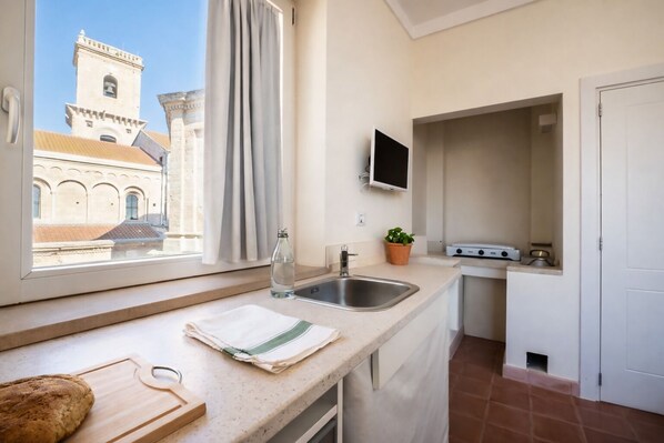 La Terrazza della Cattedrale is a charming studio apartment located on the second floor of an elegant renovated building in the heart of Nardò's historic center, one of the most fascinating towns in Salento. This holiday apartment is the ideal choice for those who wish to immerse themselves in local culture, thanks to its central location that allows for easy exploration of the wonderful landscapes and historical towns of the area. The studio is tastefully furnished and equipped with a kitchenette, including three burners, a sink, and everything needed to prepare meals, making it perfect for those seeking independent accommodation. The double bed, air conditioning, and bathroom with shower provide comfort and relaxation after a day of sightseeing. The large French door brightens the entire space and opens onto a spacious private terrace, offering a spectacular view of the lateral facade of the Basilica of Santa Maria Assunta. Here, guests can admire architectural details in perfect Romanesque style, such as the cornice and the windows of the main nave, creating a unique and evocative atmosphere. The central location of the apartment allows guests to fully experience the charm of Nardò's historic center, with its characteristic narrow streets and numerous local eateries offering typical dishes and local drinks. Furthermore, the beautiful beaches of Salento, known for their crystal-clear waters, are just a few minutes away, allowing guests to alternate moments of relaxation and cultural exploration. La Terrazza della Cattedrale is the perfect solution for those seeking a peaceful stay while being conveniently located to explore the historical and natural beauties of Salento.