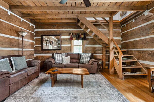 The main level also offers a full bathroom and lovely family room with big windows and a wood burning fireplace. You'll want to cozy up around the fire for a movie night on our Smart TV or call it a night on the pullout couch.