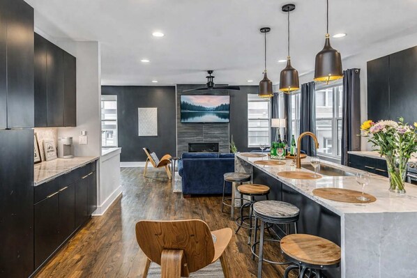 Elegant open kitchen with a marble-topped island, gold faucet, stainless appliances, and designer pendant lighting—perfect for cooking and socializing.
