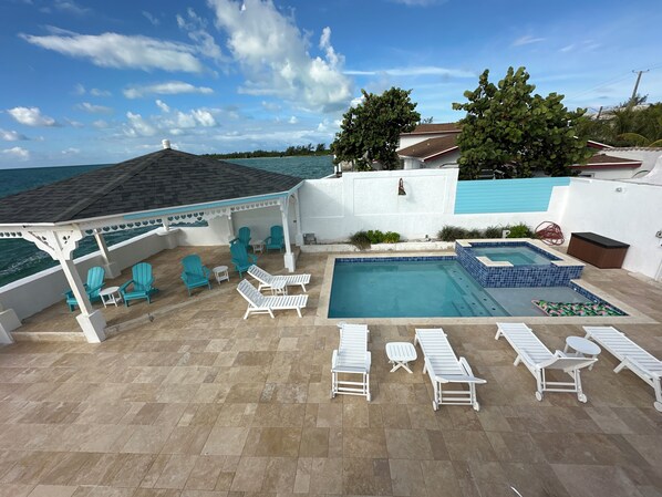 This memorable house is the perfect home base for your trip to Nassau. With 6 bedrooms including 1 king bed, 5 queen beds, and 1 bunk bed, this awesome property offers plenty of space for all guests. Enjoy 4 bathrooms with a mix of bathtubs and showers, along with 2 additional living spaces each featuring a cozy sofa bed. Whether you're relaxing in the living room or exploring the city, this wonderful house has everything you need for a pleasant stay. We're happy to assist with any questions while you stay at our house. Step out onto the back deck and observe your Ocean Oasis! 180 degree views of the ocean. complete with an outside Bar, outside kitchen and Large inground swimming pool and hot tub!