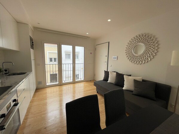 Take advantage of renting in a brand new building in the heart of Nazare This beautiful 1 bedroom unit, with 2 adorable verandas with an ocean view of the amazing Nazare beach. Fully equipped kitchen and living room combo with Smart TV, Google nest speaker, and super fast WIFI. You can have 2 extra guests who can sleep on the comfy pull-out sofa., unit sleeps 4 total. This unit was prepared with comfort and rest in mind. In this unit, you will sleep on the best mattress in Europe made by a leading company in Europe. The unit is located in the only building with full ADA access in the heart of town that includes an elevator. Steps away you will find a Mini Market with fresh bread, fruits, and vegetables, a butcher, 3 coffee shops, 2 barbers, and a Hairdresser. In front of the building, you have the top-rated fish restaurant and the best meat restaurants in Nazare. Additional features include a safe, games, a Dolce Gusto coffee machine, dishwasher, washing machine, Central AC, secure entrance, blow dryer, iron and ironing board, and much more. Perfect for a week of vacation or extended stay.