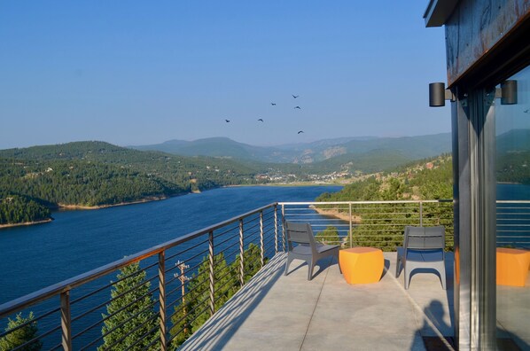 The dirt road to the home can be challenging, especially in winter. Please consider 4x4 or at least All Wheel Drive. When you first pull up to this home, you will notice its nothing like any of the other properties around! You will be able to park your car in the garage and head right into this beautiful home. There is free wifi throughout the home. When you first walk in from the garage you will be in the "mud room" and that's where the washer and dryer are which you have access to during your stay. You will probably notice all the floors are concrete and heated, neat! Once you get into the house you will be swept away by the views overlooking the Barker Reservoir, and how open the floor plan is with the kitchen and living room. Step outside to the huge deck where you can enjoy a nice BBQ dinner while hanging by the fire pit with the family. Please note: It is difficult to darken the living room for daytime TV or movie viewing. There is a flat screen in the bunk room for better day viewing but not a lot of seating.