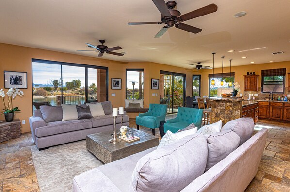On the tranquil waters of Needles, California, Riverfront Villa welcomes you to a serene retreat. With a private loading dock for your boat or jet ski and spacious garage for storage, you'll feel right at home. The property features two units: a 3-bedroom main home with 2 baths and an additional unit with 2 bedrooms and 1.5 baths.