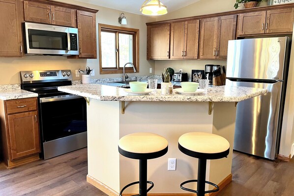The kitchen is stocked with the essentials you’ll need to cook meals at home or enjoy some of the great restaurants in the area. Our favorite restaurant is the Greenside Grille, which is only one mile from the house. There’s a Kwik Trip and Dollar General within three miles of the house, and a Super Walmart in nearby Wisconsin Rapids.