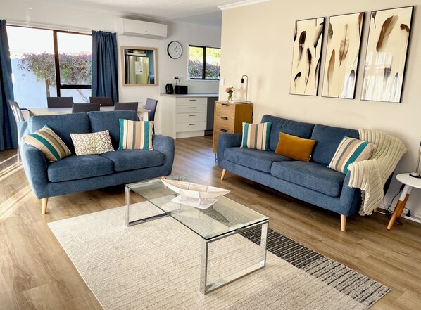 This two bedroomed house is fully equipped to ensure that it feels like a home away from home. The sunny living room has windows to the north and east ensuring all day sun with views of the flower filled garden. This quiet sunny spot is a wonderful place to relax with a book, listen to some music via the Bluetooth speaker or watch a DVD or selection of TV channels on Freeview on the 32" flat screen TV. The TV has Smart Vu so you can watch You Tube, Netflix (own account required), etc. The living/dining/kitchen area is an open plan L shape adding to sociability. The dining table seats up to 6 people.