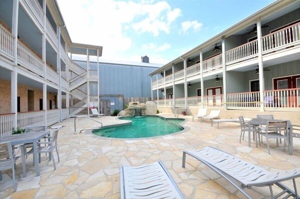 This very popular condo offers the best River patio in the heart of Gruene. Our place is perfect for friends and family gatherings, and get togethers. The back deck is extra large In order to accommodate larger gatherings. El Patio Grande, unit 105, is located on the first floor, adjacent to the pool, in The Village at Gruene. The premier site for the perfect Gruene/ New Braunfels getaway located in the heart of Gruene, Texas. Unit 105 is the most requested unit in the complex because of the large patio in the back which provides the tenants with ample living space to entertain, eat and relax. We have an established reputation for providing quality linens and exceptional furnishings. This fabulous unit is a 3/2 with all the amenities a doting traveler would expect: the finest linens, two large Smart TV's and cable, granite countertops, finely appointed living area, a loaded kitchen for all of your cooking pleasures. The master contains a queen bed, a single pull out, and an attached full bath with tub and shower. One guest room has a very nice wooden bunk with a double bottom. The other guest room has A queen and a twin bed. All the mattresses are top of the line as the owner spared no expenses in his unit. A full washer and dryer including detergent is included for your vacation needs. A spacious patio overlooks the beautiful Guadalupe River. Additional amenities include the pool areal with a granite waterfall, a walkway to the Guadalupe where the guests may sit and watch the tourists pass on toobs, barbeque on one of the two grills or wade into the water to enjoy the cool waters of the Guadalupe. The complex is located in the heart of Gruene, Texas and is walking distance to all of the Gruene offerings including Live Music,Rockin’ R, Gruene Hall, and a wide range of restaurants boutiques and antiques! ALL within walking distance. Gruene Mansion offers a wonderful breakfast!!