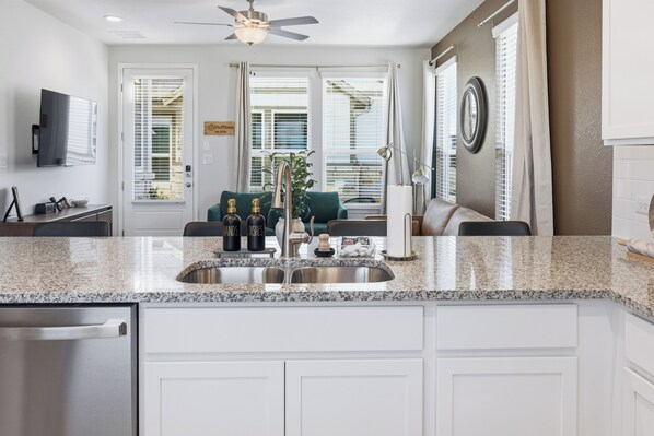 Kitchen & Dining The fully equipped kitchen features modern appliances, cookware, utensils, and a coffee-ready setup, including a Keurig Duo for both single-serve cups and full carafes. The dining area offers seating for up to 8 guests (table and bar seating), making it perfect for shared meals, game nights, or planning your day.
