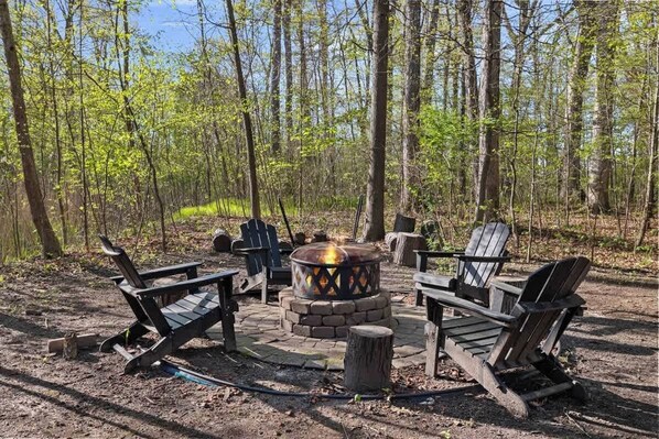 You’ll enjoy the serene sounds of birds chirping while lounging on the screened-in porch or choose to unwind outside in the home’s latest amenity: a six-person hot tub. Dine alfresco on the ground-level deck and end your evening with a round of s'mores at the rustic firepit.