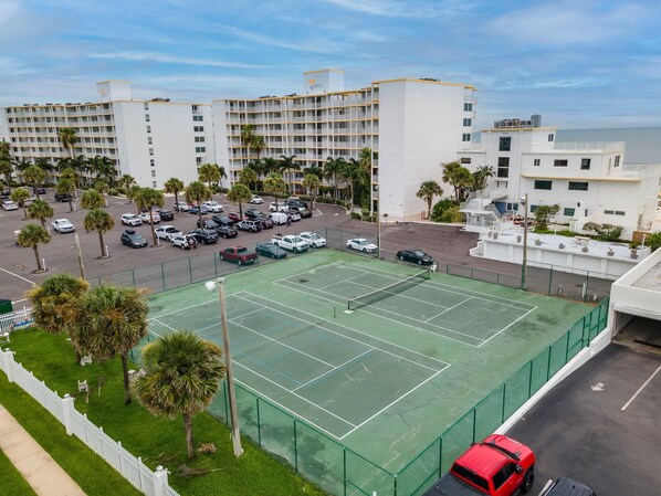 Recreational amenities at the condo include an outdoor tennis court.