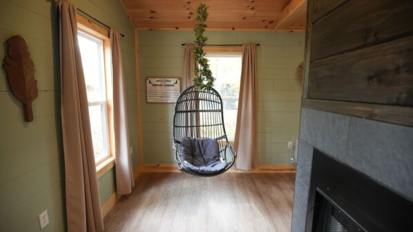 This secluded log cabin features a Colonial American theme with white-washed log walls and soothing blue trim. This cabin offers a full kitchen and eating area so you can make that special meal, if you so choose. The living area has a plush loveseat couch and Roku Smart TV where you can relax and catch up on your next Netflix binge. Featured in the bedroom is a gas fireplace and jacuzzi, which adds to the romantic ambiance you are looking for in your getaway. In the bedroom, you will find a memory foam queen sized bed facing a rustic gas fireplace. In the corner, we have a jacuzzi tub for those times when you just want to relax inside. If you would rather surround yourself with the lush natural beauty of WNF, step out onto the screened-in porch and relax in our luxury, state-of-the art Viking/Balboa hot tub while listening to the songs of the forest.