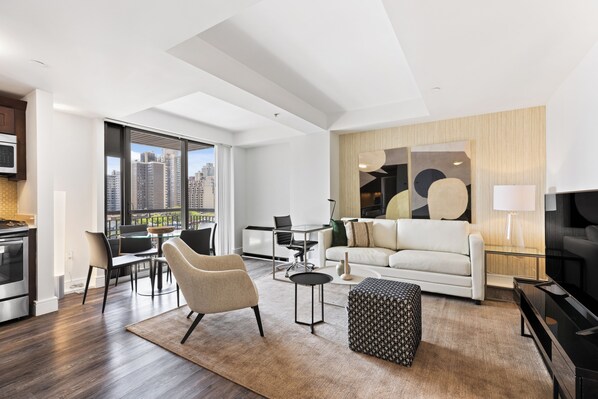 This apartment is professionally managed by Furnished Quarters, the largest independently owned and operated supplier of short-term furnished housing with over 25 years of experience in the industry. This luxury high-rise provides a traditional New York residential experience. Immerse yourself into the penthouse amenities that offer rest and repose and a long day of exploration, such as the carefully curated lounge, expansive fitness center, private courtyard, billiards room, and more. Enjoy your stay in this spacious two-bedroom apartment in a luxury building. The apartment features a private balcony, fully-equipped kitchen, ample closet space, and a private balcony. All beds provided are fitted with plush linens and pillows. All Furnished Quarters apartments include 24/7 guest service.