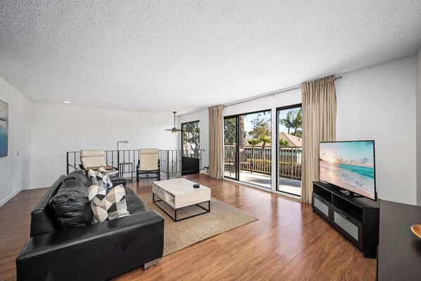 On the second floor, the open living space is designed to make the most of the home's prime location. Feel the coastal breeze in the large living room perfect for family gatherings and relaxation. The fully equipped kitchen provides everything you need to create gourmet meals, while the two additional bedrooms are spacious and comfortable, each with access to their own bathroom. The second floor also features sliding glass doors that open to the balcony with an unobstructed view of the Chanel Park and the boasts in the Chanel. The living room is equipped with a smart TV.