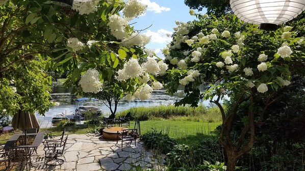 The yard has a spectacular new stone patio with built-in fire-pit, fire pit seating, and outdoor dining with umbrella.