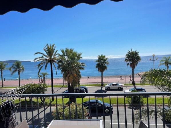 Stunning view from the Apartment of the Prom and Med - good place to watch Sunrise and have a drink at evening close. The apartment is fine, just needs some updating- a fresh lick of pain, and new cushions. The location is perfect for Bus's to Cannes, Antibes, St. Paul de Vance, getting into the old Town of Nice. Renting bikes from the Radisson Hotel was our highlight. Location is perfect for early morning swimmers, walkers. This was our second visit. Great holiday.