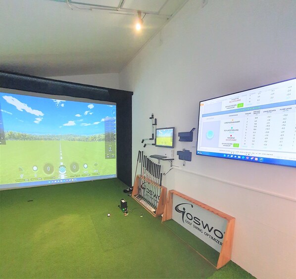 Wir sind Partner von GOSWO-Golf-Trainingshilfen. Als einziges Unternehmen weltweit entwickelt, produziert GOSWO Trainingshilfen für Golfspieler und bietet spezielle Kurse, Schwunganalysen bzw. Performance Workshops an. Nach Terminabsprache kann der Indoor-Golfsimulator von GOSWO (ca. 300 m von der Ferienwohnung entfernt) zu Trainingszwecken gebucht werden. (nur für Rechtshänder). Die Anlage verfügt ebenso über einen Putt-Simulator mit Putt-Analyse-Software. Wenn´s draußen ungemütlich wird, muss der Golfspieler nicht auf seine Golfrunde verzichten. 30 Top-Golfplätze aus aller Welt können hier virtuell gespielt werden. Buchungsanfragen für den Indoorgolfsimulator bitte direkt über unseren Partner GOSWO via E-Mail an info@goswo.de