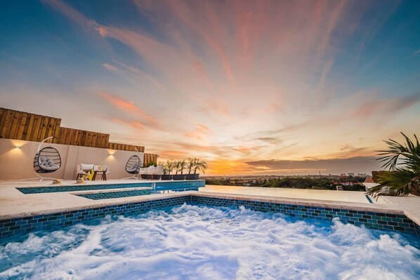 ✔️ Infinity Pool, Heated Jacuzzi, Sun Lounges, Seating for 10, BBQ Grill, covered Patio