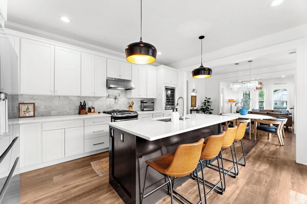 The kitchen features a gas range, 48-bottle wine fridge, and lots of counter space. It is equipped with most everything you should need to make a delicious meal - a variety of pots, pans, dishes, knives, cooking utensils, a full spice drawer, some dry goods, and a full pantry for you to store your food. There are 4 seats at the kitchen island.