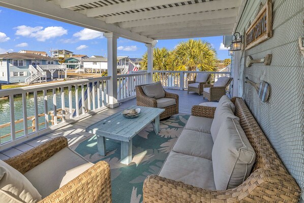 Welcome to Salty Beach hosted by KT-Escapes in CHERRY GROVE BEACH, NORTH MYRTLE BEACH, SC - 100 yards straight walk to the beach. This beach house has everything you could ask for and more!! Gorgeous HIGHLY upgraded and newly remodeled channel home with tons of amenities only 100 yards (1 block) from the Cherry Grove Beach! Multiple balconies, widow's perch to see all of Cherry Grove and the Ocean, plus a fully stocked chef's kitchen, HUIGE OUTDOOR AREA with PRIVATE BAR, gas fireplace, two smart TVs, refrigerator, PING PONG TABLE, WEBER propane grill, FLOATING DOCK (you can tie your boat up to), PRIVATE FISHING PIER with fish cleaning station, bathroom, shower, and ample patio seating to spread out. 3,000 SF custom home comfortably sleeps 20 with 5 BR+4 BA. There are 3 KAYAKS (2 ocean kayaks and 1 tandem kayak) and ample beach equipment. Generous driveway w/ space for 7 cars and trailer parking.
