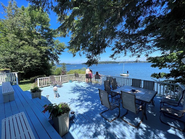 The huge deck overlooking the bay and our garden descending to the waterfront features barstools, dining table and chairs; daylong shady and sunny patches.
