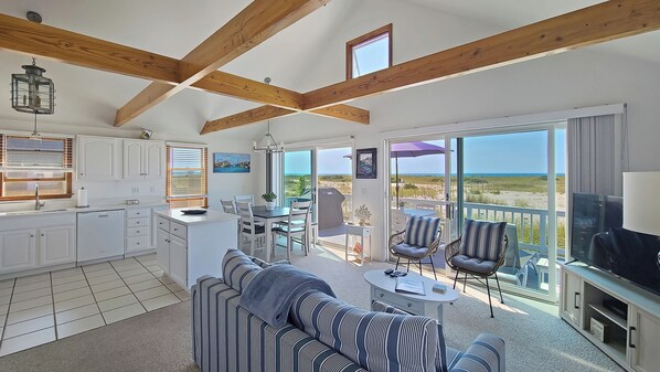 Enter an open and bright main living space with living room, dining area and kitchen. This spacious area has vaulted ceilings, a ceiling fan and and two sliders to the deck. Enjoy wonderful views of the beach and bay from the main living area. The living room has a pull-out queen sofa (for additional sleep space), a flat screen TV with cable and WiFi. The nicely-equipped kitchen has granite countertops, a dishwasher and an island. The dining area, next to the kitchen, has a dining table.