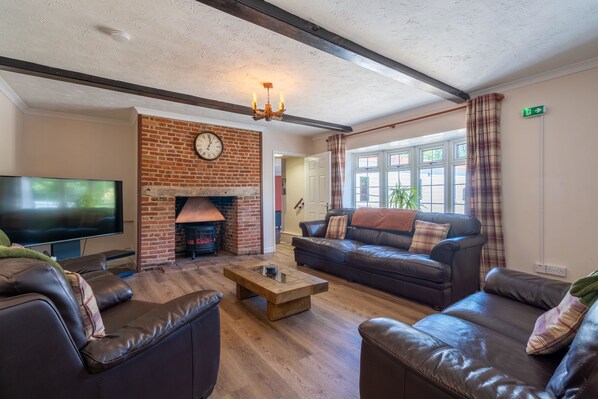 Off the hallway is the large and well fitted lounge. Leather sofas give enough seating for 8 and the original brick fireplace is a great feature with an electric, realistic looking electric woodburner. Huge TV and solid wood tables. The view out onto the front courtyard. There is a fascinating heavy horse harness collar on the wall, reflecting the history of the farm and a perfect corner for a large dog crate if your dog needs one.