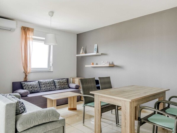 Located in Novalja, this apartment can accommodate 4 people in a bedroom as well as a living cum dining room which has a double folding bed. Balcony makes for a spot where you can admire the ebb and flow of deep blue waters. Ideal for a family, kids are also welcome here.