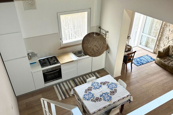 Description: first floor of a terraced house in Conero stone. Completely renovated and tastefully furnished. Large living room with sofa, dining table and kitchenette with dishwasher - mezzanine with double sofa bed - master bedroom with double bed - bathroom with shower cubicle and washing machine - small terrace with awning overlooking the private, fenced garden equipped with table and seats.