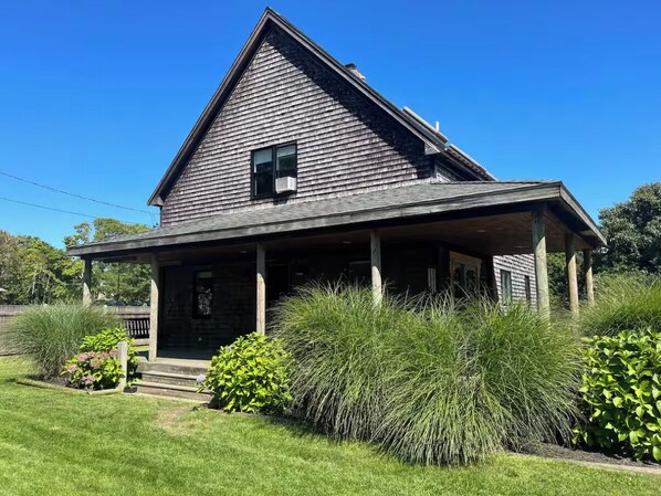 The farmer's porch entryway looks out over the front lawn. There is a smaller back deck and outside shower that open up to a private fully fenced and gated back yard with a firepit.