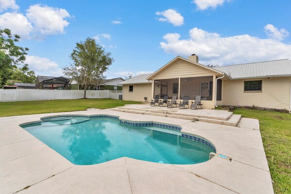 Outdoor pool, a heated pool - 4 BR/2 BA, Private HEATED Pool, Split Floor Plan, 2 King Beds, Yard, 2218 SQ FT! (Ocala)
