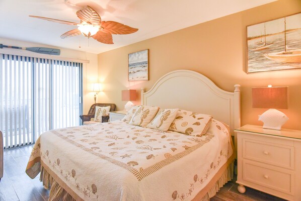 Step off your first-floor balcony and into the sand. This spacious first floor 2 bedroom, 2 bath oceanfront condo (~1050 square feet) opens directly onto the beach. This unit can sleep 8-10 people comfortably. There is an assigned parking space and additional free parking on the street adjacent to the unit on both 72nd and 73rd street. Listen to the waves crash and smell the salty air as soon as you open the balcony door from the living room or master bedroom. The large balcony with gate access and steps to the beach is perfect for relaxing with your morning coffee or evening drinks . Spend a week enjoying and relaxing in this peaceful, family friendly atmosphere right on the beach in this updated unit. The master bedroom is direct oceanfront with views from the sliding door to the balcony.