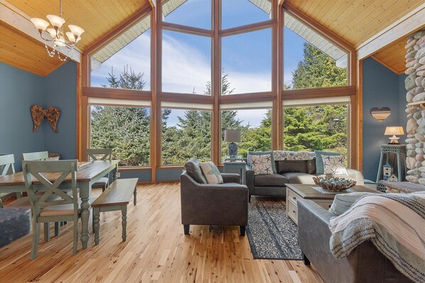 Escape to Journey's End, a charming A-frame cedar cabin on the Washington Coast with serene beach vibes. Unwind in style by admiring the forested dunes and Pacific Ocean from the great room's 2-story wall of windows, while enjoying contemporary beach accents and a stone fireplace.
