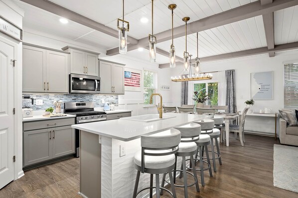 Start your day with a cup of coffee on the front porch, back patio or in one of the many cozy reading spots within the home. You'll enjoy preparing delicious snack platters and wonderful meals in the modern kitchen complete with walk-in custom pantry, counter seating for four and every modern kitchen amenity that you could want for a memorable stay at the beach.