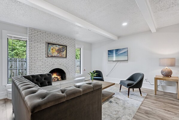 - Bright Living Room: Cozy seating, indoor fireplace, TV