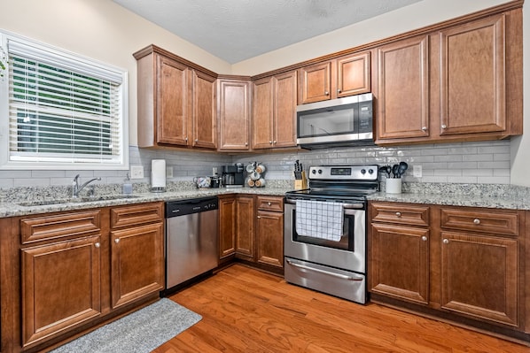 In the Villages at Midtown neighborhood, this beautiful 4-bedroom home invites you to unwind in a cozy atmosphere. Enjoy cooking meals in the fully stocked kitchen or relax with family and friends by playing pool or lounging in the spacious living room.