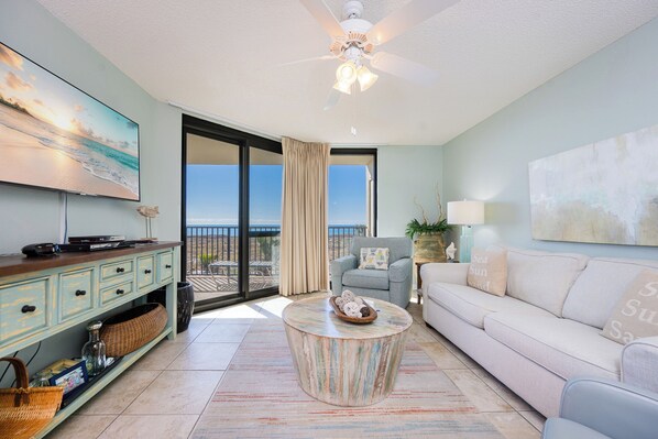 Interior: Discover comfort and sophistication in the living area, where a queen sofa sleeper and three additional comfortable chairs beckon you to relax and unwind. The tile flooring adds a touch of warmth and elegance to the space, creating a serene ambiance that instantly puts you at ease. Retreat to the master bedroom sanctuary, boasting a luxurious king-size bed and direct access to the beachfront balcony, where breathtaking views await. Indulge in the ensuite bath, featuring a separate vanity area for added convenience and luxury. The second bedroom offers two nautical themed full-size beds, perfectly complementing the beachside elegance of the unit, with a connecting bathroom for added comfort and privacy.