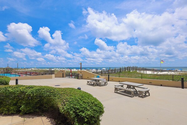 Escape to a cozy Gulf front condominium with colorful nautical-themed artwork, plush leather furnishings, and an inviting living area. Enjoy the spacious ground floor patio with seating for six or step through the sliding doors to access your private oasis just a few steps from beachfront bliss.