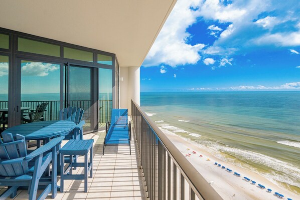 Outside, your private balcony awaits. Enjoy your morning coffee at the bistro table for four and be on the lookout for dolphins in the emerald waves. After days spent playing in the surf and splashing in the Gulf-front pools, dine al fresco on your balcony with the most spectacular backdrop there is.