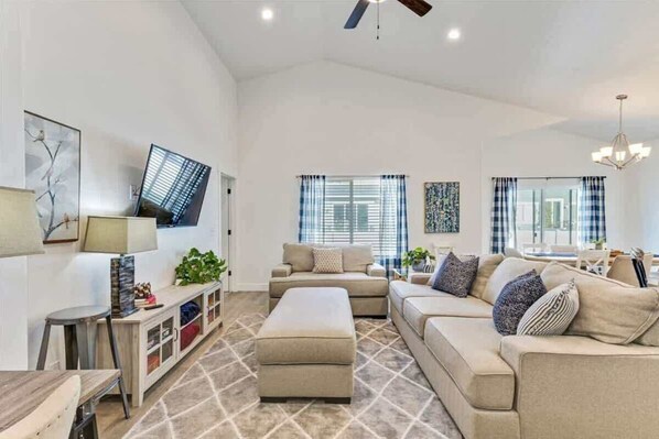 When you enter the house, you are enter through the beautiful kitchen. The kitchen then opens up into a cozy and spacious living room. The design is clean and warm to make you feel at home. There is a large smart tv mounted on the all with plenty of seating for everyone.