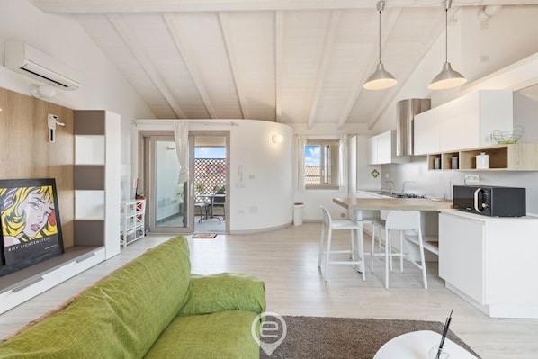 The apartment features an air-conditioned double bedroom 🛏️❄️ for cool and restful nights. The living room includes a sofa and a TV 📺, perfect for relaxing after a day of adventures, and opens onto a fully equipped kitchenette with a fridge, microwave, and stovetop 🍽️.