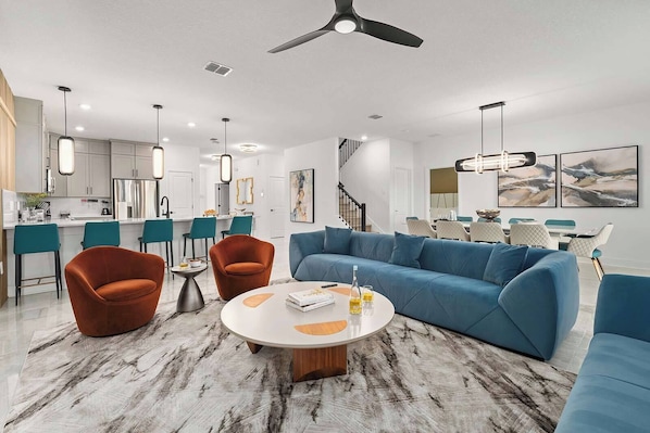 Whether you’re whipping up or warming up your vacay meals, this masterful Kitchen will help you handle it all with ease. The cabinets and drawers are fully stocked with tableware and cookware. The gadgets and appliances allow for all kinds of cooking (or reheating). And the large black island–which doubles as a breakfast counter with 5 comfy stools–offers a ton of space to prep or lay out a spread.