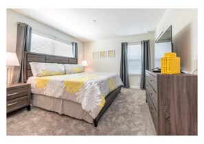 In the desirable Championsgate Resort, this 5-bedroom townhouse offers luxury living space to sleep up to 10 guests. Unwind in the private screened plunge pool or take advantage of a communal lagoon-style pool and splash park at your fingertips. With access to multiple sports courts, an arcade room, movie theater and more resort amenities await.