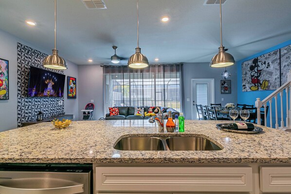 Additionally, there is a private game room equipped with 1 arcade, foosball table, air hockey and a TV. The game room also includes a futon couch for an additional guest. Each bedroom is adorned with a unique theme and Smart TV. The open-concept layout of the kitchen, living room, and dining room overlooks the pool and backyard, enhancing your enjoyment of quality moments with loved ones