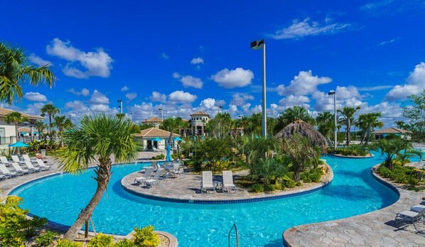 Welcome! This luxurious & family friendly 8BR Orlando resort vacation home sleeps 19 people, and features 6 KING beds, private and enclosed pool & spa, and resort amenities included at the exclusive Oasis Club & new Retreat Water Park, w/ lazy river, 2 large pools, water slides, arcade, tiki bars and grills, and more! Home features include a movie room, pool table lounge, and a game room for the kids/adults! Located only minutes from Disney World, Universal Studios and all Orlando attractions. Included are The Championsgate Retreat Club and Oasis Clubhouse amenities (NO EXTRA FEE!). This private gated resort community includes outstanding facilities, including the Retreat Club water park with water slides, large resort-style swimming pools with restaurants and bars, large lazy river, mini-golf, relaxing lounge chairs, fitness center, arcade, and more, providing enough entertainment without having to leave the community. Distance to Disney and other attractions: - Hollywood Studios: 12 miles - EPCOT: 13 Miles - Animal Kingdom: 13 miles - Magic Kingdom: 14 Miles - Universal Orlando: 20 miles - SeaWorld: 17 miles - Orange County Convention Center: 18 Miles - Closest Beaches: 72 miles Home Features: - Private pool deck with heated pool and spa (pool and spa heating is an additional fee of $40 per day, see below for heating info and disclaimers) - New comfortable patio furniture and outdoor dining area. - Fully updated and equipped kitchen, with eat-in kitchen island table - Large dining room table attached to a relaxing family room - Large smart TVs with cable and streaming service options - Movie theater room with 9 theater recliner chairs and an 86 inch screen - Pool table lounge - Game room with foosball, pop a shot basketball, air hockey and a comfy couch. - Eight total bedrooms that sleep 19 people, including six king size beds, and seven twin beds for the kids. - Plenty of free, adequate parking, 3-4 normal cars in the driveway, plus street parking. (must follow street parking rules) - Free, fast and reliable WiFi internet - Central air conditioning and heating - In unit washer and dryer, iron and board Eight bedroom features: Downstairs: Master Suite 1 - King size bedroom with smart TV and ensuite private full bathroom Master Suite 2 - King size bedroom with smart TV and ensuite private full bathroom Upstairs: Bedroom 3 - King size bed with smart TV and ensuite shared full bathroom Bedroom 4 - King size bed with smart TV and ensuite shared full bathroom Bedroom 5 - King size bed with smart TV Bedroom 6 - King size bed with smart TV Bedroom 7 - Four twin bunk bed room with two bunks and smart TV. Bedroom 8 - Three twin bed room, with one bunk bed and smart TV. - Included in bedrooms: pillows, linens, sheets, closets with hangers and shelves, hair dryers Bathrooms: - Five full bathrooms - Stocked with fresh towels - Baths with a shower - Vanity / Mirror - Toilets, toilet paper and hand soaps Kitchen and Dining: - Fully updated and equipped kitchen, with eat-in kitchen island table that seats four guests - Large dining room table attached to a relaxing family room - Electric stove, oven, refrigerator/freezer water/ice dispenser, microwave, dishwasher, coffee maker, toaster, blender, sink, hot & cold water, serving trays, glasses, silverware, pots and pans Movie Theater Room: - Featuring nine theater style seats - 86 inch smart tv with streaming options Game-room: - Includes foosball, pop a shot basketball, and air hockey Covered pool area: - Completely enclosed, minimal bugs and mosquitos - Swimming pool and spa (pool and spa heating is an additional fee of $40 per day) - Temperatures: Pool 86 - Spa 104 - The spa does not stay heated like a hot tub, it only heats when you turn on the timer. - Pool heating during the winter months is not guaranteed if outdoor temperatures are under 60. - Pool safety fence available - Sun Lounge chairs - Seating and dining area with table and chairs POOL HEATING FEE = $40 per day, and must include your entire stay. - Must be added to reservation prior to arrival. * Pool disclaimer: Although we will set the Pool temperatures to 86, no specific regular pool temperature is guaranteed by this service. During and after cold fronts, or in winter generally when days are short, pool heaters may struggle, or even be unable to keep the water at the same temperature until the weather gets warmer. The optional pool heater service must be ordered and paid before our service personnel can turn it on. We suggest ordering pool heat prior (48 hours) to your arrival. Without optional pool heat, pool temperatures can go down to 50-60°F in December to March depending on the weather. The pool heater will help to warm up the pool faster when it gets warmer outside, however, you should not expect “bathtub temperatures” during, or after Central Florida winter cold fronts or cold nights. * Unfortunately, we are unable to activate / deactivate the pool heater on short notice or provide refunds for previously ordered pool heater service. We reserve the right to make pool heat unavailable at any time for maintenance or repairs. In case of a technical malfunction, we will refund the pool heat charge for the time the heating service was not available to you. No further credit will be given if pool equipment fails or is unavailable for any reason. POOL WEEKLY SERVICE: Our pool is serviced once a week to ensure the PH is just right for our guests! Please do not be alarmed if you see someone on the patio checking or servicing the pool. Service days are typically on Thursday or Friday. HOUSE RULES: - Enjoy yourselves! :) - You must be 25 years of age to confirm a reservation. - All trash must be placed in trash bags, and then in the bin by the front door. - DO NOT leave doors and windows open (Florida is hot, the a/c will stop working and you`ll have insects, or lizards visiting you in your sleep. - Accidents happen. Inform us immediately about any damage. This way we can ensure the h