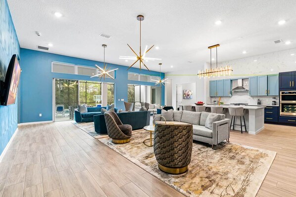 We LOVED the house! The layout, the updated decor, all the many windows to let the sun in - sooo much comfort and convenience, even for a large house . There was plenty to keep everyone entertained including the movie theatre, multiple game rooms, outdoor ping-pong not to mention the pool and jacuzzi. The kitchen was great - including two full size refrig-freezers, and as far as cleaning clothes, the three pairs of washer-dryers more than did the job. The few issues requiring immediate attention were addressed so quickly that we all joked 'If only we could get this type of service at home'. In terms of location, the house is ~30 mins from Disney and MCO - but remember, you are in the greater Orlando area and there is a lot of traffic. The only critique we would have about the house both involved shower doors not sealing completely resulting in some water on the floor. The shower in the master bath was especially concerning. Beyond that, we were a bit surprised that there was an extra charge to heat the pool and jacuzzi (I.e., ~$70/night). But all in all, our house made the week with all our kids and one grandchild a memory we will always share.
