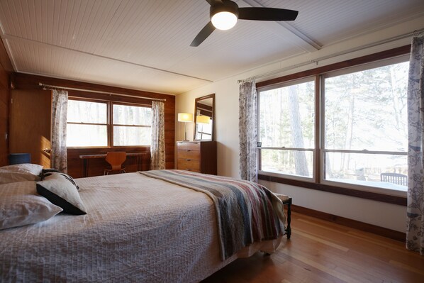 The cabin was originally part of a summer camp and is one of the few original buildings that remain. Decorated in the style of "midcentury-modern camp," it is cute and fun, with a well-stocked, large kitchen that opens up to the living and dining area. The spacious master bedroom and ensuite bathroom offers amazing views of the lake with abundant space for storage. The bunk room has two sets of twin bunk beds with closet space and shelving for all. We provide clean bed linens, a few towels, and firewood.