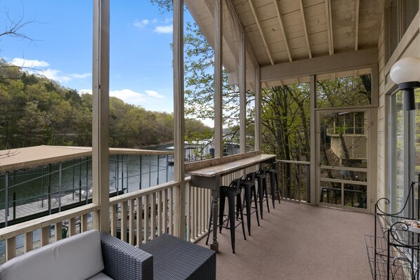This property is tucked in a cove off the main channel to keep your boat or kids safe soaking up waves in the lake. Features include a master suite with 2 king size beds, full bath and private deck. The second and third bedrooms offer 2 queen size beds and each with a full bath and private deck.